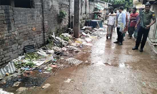 মধুপুর (টাঙ্গাইল): পৌর শহরের সাহা পাড়া সড়ক পরিদর্শন করছে উপজেলা নির্বাহী অফিসার জুবায়ের হোসেন -সংবাদ