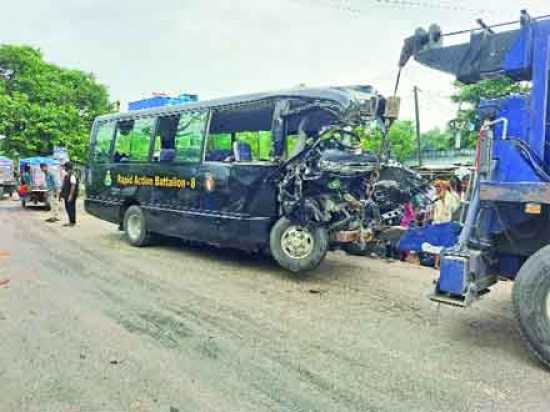 পটুয়াখালী মহাসড়কে শনিবার যাত্রীবাহী বাসের সঙ্গে সংঘর্ষে ক্ষতিগ্রস্ত র্যাবের মিনিবাস রেকারে সরিয়ে নেয়া হচ্ছে -সংবাদ