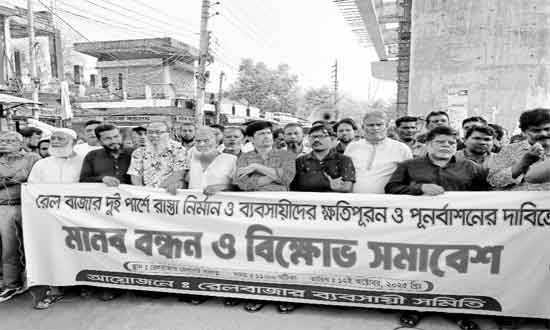 রোববার বেলা ১১টায় রেলবাজার রোডে এ কর্মসূচি পালন করে রেলবাজার ব্যবসায়ী সমিতি। মানববন্ধনে অংশ নিয়ে বক্তারা বলেন, রেলবাজার এলাকার সড়ক সম্প্রসারণ প্রকল্পের কাজের কারণে চলাচল ও ব্যবসায়িক কার্যক্রম মারাত্মকভাবে ব্যাহত হচ্ছে। প্রতিদিনই ছোট বড় দুর্ঘটনা ঘটছে। এই এলাকাটি এখন শহর থেকে বিচ্ছিন্ন হয়ে পড়েছে। ফলে বহু ব্যবসায়ী ক্ষতিগ্রস্ত হয়েছেন। বারবার প্রশাসন ও সড়ক বিভাগকে জানিয়েও কোন প্রতিকার মেলেনি। তারা ক্ষতিপূরণ ও বিকল্প পুনর্বাসনের দাবি জানান। সমাবেশে বক্তব্য দেন জেলা বিএনপির সাংগঠনিক সম্পাদক সফিকুল ইসলাম পিটু, জেলা দোকান মালিক সমিতির আহ্বায়ক মঞ্জুরুল আলম মালিক লার্জ, সাধারন সম্পাদক সুমন পারভেজ খান, পৌর বিএনপির সভাপতি সিরাজুল ইসলাম মনি, সাধারন সম্পাদক মাহমুদুল হাসান পল্টু, জেলা পরিবেশক সমিতির সাধারন সম্পাদক মাহবুব জোয়ার্দ্দার রিংকু, জাসাসের সাধারন সম্পাদক সেলিমুল হাবিব ও রেলবাজার ব্যবসায়ী সমিতির নেতা সামিউল ইসলাম।