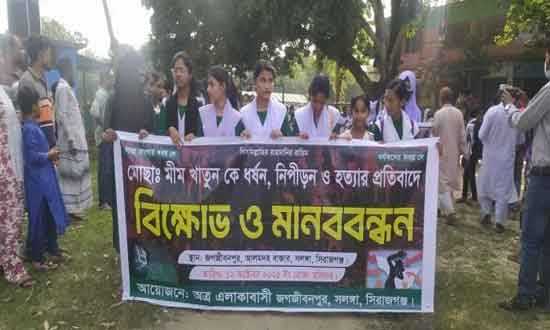 সিরাজগঞ্জের উল্লাপাড়ায় ১৩ বছর বয়সী স্কুলছাত্রী মিম খাতুন হত্যার প্রতিবাদে ফুঁসে উঠেছে সাধারণ মানুষ। ঘাতক ধর্ষকের দৃষ্টান্তমূলক শাস্তি ও ফাঁসির দাবিতে শিক্ষক, শিক্ষার্থী ও এলাকাবাসীর উদ্যোগে বিক্ষোভ ও মানববন্ধন অনুষ্ঠিত হয়েছে। গতকাল রোববার বিকেলে সলঙ্গা ইউনিয়নের জগজীবনপুর সরকারি প্রাথমিক বিদ্যালয় মাঠ থেকে শুরু হয় মানববন্ধন। পরে বিক্ষুব্ধ জনতা শোক ও ক্ষোভের প্রতীক হিসেবে জগজীবনপুর বাজারে গিয়ে সড়ক অবরোধ করে প্রতিবাদ জানান। এই মানববন্ধনে বক্তব্য রাখেন জগজীবনপুর সরকারি প্রাথমিক বিদ্যালয়ের প্রধান শিক্ষক আব্দুল লতিফ, শহরিয়ারপুর সরকারি প্রাথমিক বিদ্যালয়ের শিক্ষক আবুল কালাম আজাদ, আঙ্গারু বালিকা এস.এন.বি. উচ্চ বিদ্যালয়ের সহকারী শিক্ষক আল আমিন হোসেন এবং জগজীবনপুর রানীনগর নূরানী ও সন্ত ইবতেদায়ী মাদ্রাসার মাওলানা মোস্তফা কামালসহ স্থানীয় শিক্ষক-শিক্ষার্থী ও গণ্যমান্য ব্যক্তিবর্গ।বক্তারা বলেন, একটি শিশুকে এভাবে নির্মমভাবে ধর্ষণ করে হত্যা করার সাহস যেন আর কেউ না পায়। আমরা ঘাতক ধর্ষকের ফাঁসি চাই। উল্লেখ্য, গত বৃহস্পতিবার সকালে উপজেলার সলঙ্গা ইউনিয়নের খোঁজাখালী গ্রামের একটি কাটাবাগান থেকে স্কুলছাত্রী মিম খাতুনের মরদেহ উদ্ধার করে পুলিশ। নিহত মিম ছিলেন জগজীবনপুর গ্রামের জাকির হোসেনের মেয়ে ও আঙ্গারু পাঁচপীর ফাজিল সিনিয়র মাদ্রাসার ষষ্ঠ শ্রেণির শিক্ষার্থী। ঘটনার পর থেকেই পুরো এলাকায় নেমে এসেছে শোকের ছায়া। মিমের সহপাঠীরা কাঁদতে কাঁদতে একটাই কথা বলেছে আমরা বিচার চাই, মিমের হত্যাকারীর ফাঁসি চাই।স্থানীয় সচেতন মহল জানান, এই হত্যাকান্ড শুধু একটি পরিবারের নয়, সমগ্র সমাজের বিবেককে নাড়িয়ে দিয়েছে। তাই প্রশাসনের প্রতি তারা দ্রুত বিচার ও সর্বোচ্চ শাস্তি কার্যকরের জোর দাবি জানিয়েছেন।