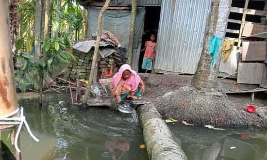 পানিবন্দী এলাকার খোঁজ নিতে গেলে দেখা যায় সেতারা বেগম নামে (৫০) বছরের এক নারী বাজার থেকে বাজার করে বাড়ির উঠনে দেওয়া লম্বা সাঁকো পার হয়ে ঘরে ফিরছেন। এবং কিছুক্ষণ পর ঘরের পাশে বসেই দুষিত পানি ব্যবহার করে গৃহস্থালি কাজ করছেন। একই চিত্র প্রায় অধিকাংশ পরিবারের।