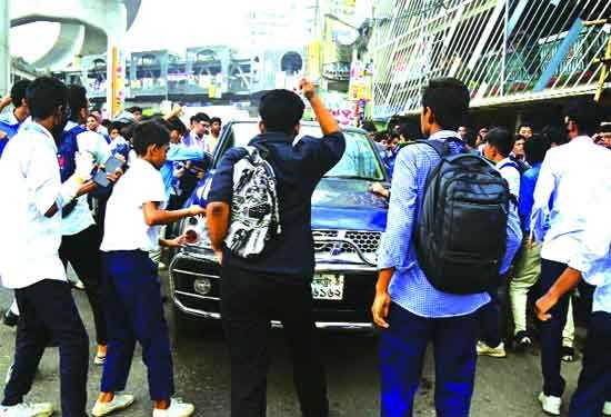 এক শিক্ষার্থীর মৃত্যুকে কেন্দ্র করে রাজধানীর ফার্মগেট এলাকার রাস্তায় নেমে আসে স্কুল-কলেজের শিক্ষার্থীরা। এ সময় বেঞ্চ পেতে, গাড়ির সামনে দাঁড়িয়ে যান চলাচলে বাধা দিতে দেখা যায় তাদের - সংবাদ
