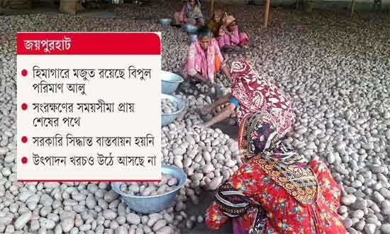 এম ইশরাত হিমাগা’র মৌসুমি আলু ব্যবসায়ী আতোয়ার রহমান জানান, ৮শ বস্তা আলু রেখেছিলাম, সব মিলিয়ে বস্তা প্রতি খরচ হয়ে ছিল ১৪৫০-১৫০০ টাকা। এখন সে আলু প্রতি বস্তা বিক্রি হচ্ছে ৫৫০-৬০০ টাকা। ফলে বস্তা প্রতি লোকসান গুনছেন হচ্ছে ৭০০-৮০০ টাকা। এম ইশরাত হিমাগা’র ম্যানেজার রাইহান জানান, গেল বছর এই সময়ে হিমাগার থেকে বেশিরভাগ আলু বের করা হলেও এ বছর এখন পর্যন্তঅর্ধেক আলুও বের হয়নি। এতে করে আমরা চরম শঙ্কটে আছি। জয়পুরহাট জেলা কৃষি সম্প্রসারণ অধিদপ্তরের উপ-পরিচালক সাদিকুল ইসলাম জানান, বিগত বছরগুলোর তুলনায় গত বছর আলু চাষাবাদ ও ফলন বেশি হওয়ায় এবার আলুর দাম কম। আর এবার আলুর লক্ষ্যমাত্রা কমানো হয়েছে বলেও জানান তিনি।