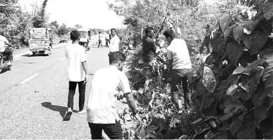 আমতলী : পটুয়াখালী-কুয়াকাটা মহাসড়কের ঝোপঝাড় পরিষ্কার করছেন তরুণরা। ছবিটি ঘটখালী থেকে শুক্রবার দুপুরে তোলা -সংবাদ