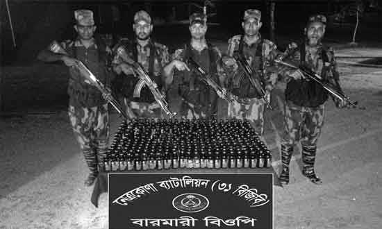 নেত্রকোনার দুর্গাপুর ফান্দা সীমান্তে ২৬৯ বোতল ভারতীয় ফেন্সিডিল জব্দ করেছে বর্ডার গার্ড বাংলাদেশের (বিজিবি) সদস্যরা। জব্দকৃত এসব মাদক নেত্রকোনা মাদকদ্রব্য নিয়ন্ত্রণ অধিদপ্তরের কাছে জমা দেওয়া হয়েছে। নেত্রকোনার ব্যাটালিয়ন (৩১ বিজিবি) অধিনায়ক লে. কর্ণেল এ এস এম কারুজ্জামান (পিবিজিএম) প্রেস বিজ্ঞপ্তিতে জানান, নিজস্ব গোয়েন্দা তথ্যের ভিত্তিতে নেত্রকোনা ব্যাটালিয়নের অধীনস্থ বারমারী বিওপি’র (বর্ডার অবজারবেশন পোষ্ট) ছয় সদস্যের একটি বিশেষ টহল দল মাদক বিরোধী অভিযান পরিচালনা করেন। মাদক দ্রব্য অভিযানে বিওপি’র দায়িত্বপূর্ণ সীমান্ত পিলার ১১৬২ নাম্বার হতে আনুমানিক ৪’শ গজ বাংলাদেশের অভ্যন্তরে ফান্দা নামক এলাকা হতে টহল দলটি মালিকবিহীন ২৬৯ বোতল ভারতীয় ফেন্সিডিল জব্দ করতে সক্ষম হন।