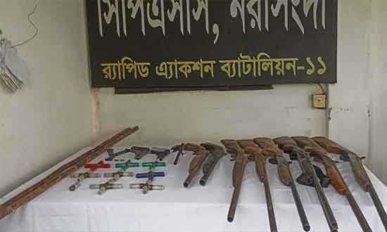নরসিংদীর রায়পুরা থানার সায়েদাবাদ এলাকায় গতকাল শুক্রবার রাতভর ‘সাঁড়াশি অভিযানে’ অস্ত্রসহ তাদের গ্রেপ্তার করা হয়। গ্রেপ্তারকৃত ৮ জন হলেন- মো. শফিক মিয়া (৩২), মো. মোস্তফা (৩৮), আয়নাল (৩৮), মহিউদ্দিন হৃদয় (২২), মো. বাচ্চু মিয়া (৬২), কালু মিয়া (৬৯), মো. বাছেদ (৪০) ও ১৭ বছর বয়সী এক কিশোর। উদ্ধার করা আগ্নেয়াস্ত্রের মধ্যে রয়েছে, ২টি বিদেশি পিস্তল, ৫টি একনলা বন্দুক, ১টি দোনলা বন্দুক, ২টি এলজি ও ১টি পাইপগান। এছাড়া ৩টি ম্যাগাজিন ও ৩৫ রাউন্ড গুলিও উদ্ধার করার তথ্য দিয়েছে র্যাব।