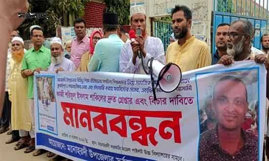 নরসিংদীর মনোহরদীতে শরিফুল ইসলাম শাকিল নামে এক ব্যক্তির বিরুদ্ধে শিক্ষক-কর্মচবারীদের নিয়ে কুরুচিপূর্ণ মন্তব্য, অপপ্রচার ও চাঁদাবাজির বিচার দাবিতে মানববন্ধন করেছে উপজেলার শিক্ষা প্রতিষ্ঠানের শিক্ষক-শিক্ষিকাবৃন্দ। সোমবার সকালে মনোহরদী সরকারি পাইলট মডেল উচ্চ বিদ্যালয়ের সামনে ঘন্টাব্যাপী এই মানববন্ধন কর্মসূচি পালন করা হয়। চন্দনবাড়ী কামিল মাদরাসার অধ্যক্ষ আবু রায়হান ভূঁইয়ার সভাপতিত্বে মানববন্ধনে বক্তব্য রাখেন, সরদার আছমত আলী মহিলা ডিগ্রী কলেজের ভারপ্রাপ্ত অধ্যক্ষ ফরহাদ হোসেন, শেখেরগাঁও ফাযিল মাদরাসার অধ্যক্ষ এখলাছ উদ্দিন, মনতলা ফাযিল মাদরাসার অধ্যক্ষ বাকিউল ইসলাম, চালাকচর উচ্চ বিদ্যালয়ের প্রধান শিক্ষক মোস্তফা হোসেন, চন্দনবাড়ী এস.এ পাইলট বালিকা উচ্চ বিদ্যালয়ের ভারপ্রাপ্ত প্রধান শিক্ষক নাসরিন সুলতানা প্রমুখ।
