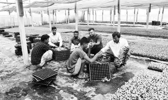 আজ তার এক বিঘা জমিতে দাঁড়িয়ে আছে তিনটি আধুনিক পলিশেড হাউজ। সারিবদ্ধভাবে সাজানো প্লাস্টিক ট্রেতে সবুজ চারার সারি যেন এক জীবন্ত শিল্পকর্ম। কেউ বীজ বপনে ব্যস্ত, কেউ পানি দিচ্ছেন যতেœ, আবার কেউ বাজারে পাঠানোর জন্য ক্যারেটে চারা গোছাচ্ছেন ভালোবাসা মিশিয়ে।বর্তমানে তার খামারে ৮–১০ জন স্থানীয় নারী-পুরুষ কৃষি শ্রমিকের সাথে নিজেও নিয়মিত কাজ করছেন।