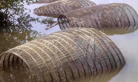 গলাচিপা (পটুয়াখালী) : বাঁশের তৈরি চাঁই দিয়ে ধরা হচ্ছে ছোট ছোট মাছ -সংবাদ