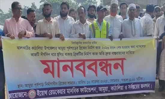 ঝালকাঠি উপজেলার আমুয়া হাসপাতাল সংলগ্ন ধোপার নদীর উপর নির্মানাধীন বন্ধ হওয়া ব্রিজের কাজ দ্রুত শেষ করার দাবিতে এলাকাবাসী ও শিক্ষার্থীদের মানববন্ধন, সড়ক অবরোধ ও র্যালী অনুষ্ঠিত হয়েছে। এ ব্রীজের নির্মাণ কাজ দীর্ঘদিন বন্ধ থাকায় চরম দুর্ভাগ্যে রয়েছে এলাকাবাসী। গতকাল সোমবার সকাল ১১ টায় ইয়োথ রেডকেয়ার মানবিক ফাউন্ডেশন এর আয়োজন করেন। ব্রিজ সংলগ্ন সড়কের দু-পাশে শত শত শিক্ষার্থী ও এলাকাবাসী প্রায় এক কিলোমিটার দীর্ঘ এ মানববন্ধনে অংশ নেন। মানববন্ধনে বক্তারা জানান, ধোপার নদীর এ ব্রিজের কাজ ২০২১ -২০২২ অর্থবছরে শুরু করা হয়, ২০২৩ সালে শেষ হওয়ার কথা থাকলেও আজও শেষ হয়নি ব্রিজর ২০ শতাংশ কাজ। ঠিকাদার কাজ ফেলে লাপাত্তা হয়ে গেছে। বিকল্প কাঠের নির্মিত লক্কর ঝক্কর ভাঙ্গাচুরা ব্রিজ দিয়ে প্রতিদিন ৯টি শিক্ষা প্রতিষ্ঠান, কাঠালিয়া উপজেলার একমাত্র আমুয়া হাসপাতাল, আমুয়া বন্দরসহ তিনটি বাজারের বিভিন্ন শ্রেনী পেশার হাজার হাজার নারী, শিশু ও রোগী যাতায়াত করছে। এলাকাবাসী ও শিক্ষার্থীরা অতি দ্রুত সময়ের মধ্যে ব্রীজটির নির্মাণ কাজ শেষ করার জন্য জোর দাবি জানিয়েছেন। মানববন্ধনে বক্তব্য রাখেন, ইয়োথ রেডকেয়ার মানবিক ফাউন্ডেশন সভাপতি মোঃ মেহেদী হাসান, আমুয়া মাধ্যমিক বিদ্যালয়ের প্রধান শিক্ষক, মনজুরুল হক,বাংলাদেশ জামাতে ইসলামীর কাঠালিয়া উপজেলা আমির মাস্টার মোঃ মজিবুর রহমান, আমুয়া ইউনিয়ন পরিষদ চেয়ারম্যান নকিরুল ইসলাম, ইউনিয়ন বিএনপি’র সাধারণ সম্পাদক আব্দুল মন্নান তালুকদার, যুবদল নেতা তুহিন মিয়া, শেখ ফজিলাতুন্নেছা ভোকেশনাল ইনস্টিটিউটের প্রধান শিক্ষক মাহবুবুর রহমান, শিক্ষার্থী সামিরা আক্তার ও অরিন্দ্র মজুমদার।