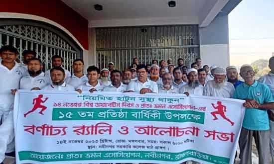 ব্রাহ্মণবড়িয়ার নবীনগরে নিয়মিত হাঁটুন সুস্থ থাকুন এই শ্লোগাকে সামনেরেখে নবীনগর সরকারি কলেজ প্রাঙ্গনে নবীনগর প্রাতধ:ভ্রমন এসোসিয়েশনের ১৭ তম প্রতিষ্ঠা বার্ষিকী পালিত হয়। অনুষ্ঠানের সভাপতিত্ব করেন প্রাতঃ ভ্রমণ এসোসিয়েশনের সভাপতি (সাবেক সিভিল সার্জন) ডাক্তার মো. সাদেক মিয়া। প্রধান অতিথি হিসেবে উপস্থিত ছিলেন সংগঠনের প্রধান উপদেষ্টা ও নবীনগর সরকারি কলেজের অধ্যক্ষ প্রফেসর মো. রেজাউল করিম, বিশেষ অতিথি হিসাবে উপস্থিত ছিলেন নবীনগর প্রেসক্লাবের সভাপতি মোহাম্মদ হোসেন শান্তি। অনুষ্ঠানটি সঞ্চালনা করেন সংগঠনের সাধারণ সম্পাদক মো.আবু কাওছার। এদিকে সংগঠনের সকল সদস্যদের উপস্থিতে ডা. মো. সাদেক মিয়াকে সভাপতি ও মো.আবু কাওছার সাধারণ সম্পাদক করে পুনরায় কমিটি সংগঠন করা হয়। এছাড়া সম্মানিত সদস্যদের ফ্রি স্বাস্থ্য সেবা সহ ৫০% ডিসকাউন্টে প্যাথোলজির ব্যবস্থা করেছেন।