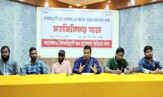 বৈষম্যবিরোধী ছাত্র আন্দোলনের কার্যক্রম পুনরায় সক্রিয় করার লক্ষ্যে কুড়িগ্রামে মতবিনিময় সভা অনুষ্ঠিত হয়েছে। মঙ্গলবার, (১৮ নভেম্বর ২০২৫) সকাল ১১টায় কুড়িগ্রাম জেলা পরিষদ হলরুমে অনুষ্ঠিত এ সভায় সংগঠনের জেলা পর্যায়ের নেতৃবৃন্দসহ বিভিন্ন শিক্ষা প্রতিষ্ঠানের শিক্ষার্থীরা অংশ নেন। মতবিনিময় সভার আয়োজন করে কুড়িগ্রাম জেলা বৈষম্যবিরোধী ছাত্র আন্দোলন।