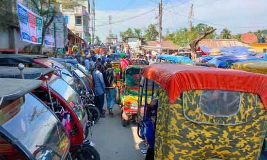 বেতাগী (বরগুনা) : বেতাগী পৌর শহরের বাজারে প্রবেশদ্বারে ‘টাউন ব্রিজ’ থেকে পূর্ব পাড় রিকশা ও অটো রিকশার তীব্র যানজট -সংবাদ