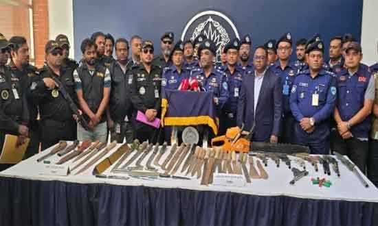 তিনি বলেন, চট্টগ্রাম জেলার আইনশৃঙ্খলা পরিস্থিতি স্বাভাবিক রাখতে এবং অবৈধ অস্ত্রধারী, সন্ত্রাসী ও ওয়ারেন্টভুক্ত আসামিদের বিরুদ্ধে কঠোর অবস্থান নেওয়ার অংশ হিসেবে বুধবার (১৯ নভেম্বর) দিবাগত রাত থেকে বৃহস্পতিবার সকাল পর্যন্ত এই যৌথ অভিযান পরিচালনা করা হয়। অভিযানকালে রাউজান থানাধীন নোয়াপাড়া, বাগোয়ান, পূর্ব ও পশ্চিম গুজরা, সুলতানপুর, কদলপুর, রাউজান ইউপি ও পৌরসভা এলাকায় তল্লাশি চালানো হয়। একই সময়ে ১৭টি স্থানে চেকপোস্ট বসিয়ে যানবাহন ও সন্দেহভাজনদের তল্লাশি করা হয়। অভিযানে ৮টি এলজি, ৬ রাউন্ড কার্তুজ, ১৪টি ছোরা, ৩টি রামদা, ২টি চাপাতি, ২টি তলোয়ার, ১টি কিরিচ ও ১টি ইলেক্ট্রিক কাটার। চেকপোস্টে ২৮টি মোটরসাইকেল ও ১টি ট্রাক আটক করা হয় এবং মোটরযান আইনে ৩৭টি মামলা দায়ের করা হয়েছে। বিভিন্ন অপরাধে আরও ৫ জনকে গ্রেপ্তার করা হয়। র্যাব-৭ এর অভিযানে উদ্ধার করা হয় ৩টি এলজি, ২টি তলোয়ার ও ১টি কিরিচ। তিনি আরও বলেন, রাউজানের আলোচিত ব্যবসায়ী হাকিম হত্যা মামলায় ইতোমধ্যে ৬ জনকে গ্রেপ্তার করা হয়েছে, যাদের মধ্যে ২ জন আদালতে ১৬৪ ধারায় স্বীকারোক্তিমূলক জবানবন্দি দিয়েছে। এই মামলায় উদ্ধার করা অস্ত্রের মধ্যে রয়েছে ৪টি বিদেশি পিস্তল, ১টি রিভলভার, ১টি চায়না রাইফেল, ১টি শর্টগান, ২টি এলজি, ৮৫ রাউন্ড গুলি, ৭টি ম্যাগাজিন, ২টি রামদা, ৫টি ছুরি ও একটি মোটরসাইকেল।