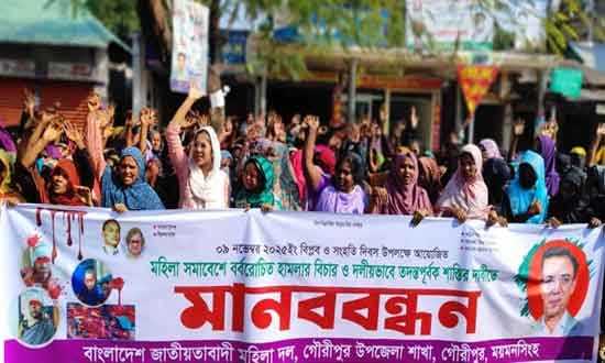 ময়মনসিংহের গৌরীপুরে নারী সমাবেশে হামলার বিচার ও ঘটনার দলীয় তদন্তপূর্বক শাস্তির দাবিতে শুক্রবার (২১ নভেম্বর/২৫) পৌর শহরের ধানমহাল কৃষ্ণচূড়া চত্বরে মানববন্ধন ও বিক্ষোভ মিছিল করে। তাদের হামলার বর্ণনা দিতে গিয়ে নারীরা কান্নায় ভেঙে পড়েন। অনুরূপ কর্মসূচী পালিত হয়েছে উপজেলার ভাংনামারী ইউনিয়নের নাপ্তের আলগী বাজারে বিক্ষোভ মিছিল ও সমাবেশ অনুষ্ঠিত হয়।