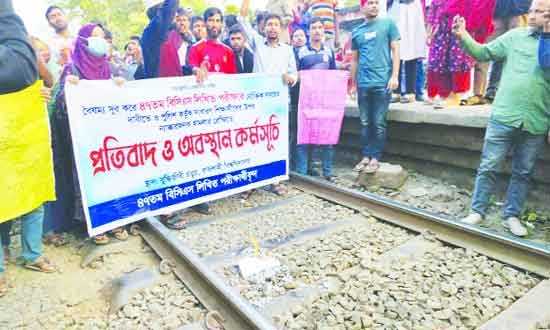 রাজশাহী বিশ্ববিদ্যালয়ের শিক্ষার্থীরা বিসিএস লিখিত পরীক্ষা পেছানোর দাবিতে বিশ্ববিদ্যালয়স্থ রেললাইন অবরোধ করেন -সংবাদ
