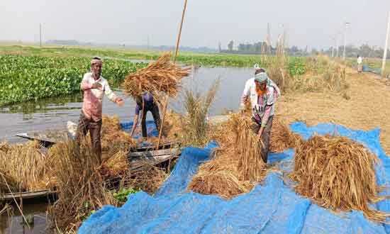 জমিতে এক হাঁটু আধ হাঁটু পানি, আবার কোন কোন জমিতে হাটুর ওপরে পানি। এখন হেমন্তের অগ্রহায়ণ মাস। বন্যার পানি নামে নাই চলনবিলের কৃষি জমি থেকে। তাই বাধ্য হয়েই নৌকা দিয়ে বোনা আমন ধান কাটছেন চলনবিলের কৃষক। এতে শ্রমিক খরচ পড়ছে দ্বিগুন। একবেলা ধান কেটে শ্রমিকদের দিতে হচ্ছে ৫শ থেকে ৭শ টাকা। প্রতি বিঘায় ফলন ৫মণ থেকে ৬মণ হলেও খরচ বাদে কৃষকদের ঘরে উঠছে মাত্র ১মণ থেকে ২মণ ধান। নাটোরের সিংড়া উপজেলার চলনবিলের ডাহিয়া ও ইটালী ইউনিয়নের কয়েকটি মাঠে সরেজমিনে গিয়ে দেখা যায়, হাঁটু পানিতে নেমে শ্রমিকরা চরম কষ্টে ধান কাটছেন। নৌকায় বোঝাই করে কাটা ধান নিয়ে আসছেন কৃষকের খোলায়। সেখান থেকে মাড়াই করে তুলছেন ঘরে।
