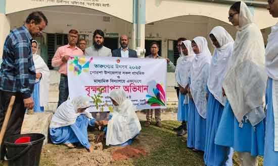 নওগাঁর পোরশায় তারুণ্যের উৎসব উদযাপন উপলক্ষ্যে উপজেলা প্রশাসনের আয়োজনে একযোগে উপজেলার সকল প্রাথমিক ও মাধ্যমিক শিক্ষা প্রতিষ্ঠানে বৃক্ষ রোপণ করা হয়েছে। মঙ্গলবার,(২৫ নভেম্বর ২০২৫) সকাল ১০টায় উপজেলার শহীদ পিংকু বালিকা উচ্চ বিদ্যালয়ে বৃক্ষ রোপণের উদ্বোধন করেন উপজেলা নির্বাহী অফিসার রাকিবুল ইসলাম। এসময় প্রাথমিক শিক্ষা অফিসার সাজ্জাদ হোসেন, মাধ্যমিক শিক্ষা অফিসার শামসুল কবিরসহ শিক্ষা প্রতিষ্ঠানের শিক্ষক ও শিক্ষার্থী উপস্থিত ছিলেন। একই দিনে উপজেলার ৮৭টি প্রাথমিক বিদ্যালয় ও ২৭ টি মাধ্যমিক বিদ্যালয়ে একযোগে ফলজ ও বনজ বৃক্ষের পাশাপাশি স্কুল গেটের দু’পাশে একটি করে সোনালু ও জারুল গাছের চারা রোপণ করা হয়েছে।