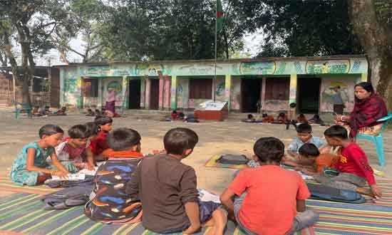 কিশোরগঞ্জ (নীলফামারী) : ভবন পরিত্যক্ত ঘোষণার পর থেকে বাইরে পড়াশোনা করছে দক্ষিণ মেলাবর সরকারি প্রাথমিক বিদ্যালয়ের শিক্ষার্থীরা -সংবাদ
