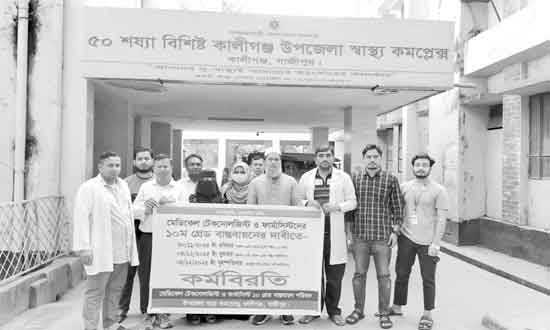 কালীগঞ্জ (গাজীপুর) : ১০ গ্রেড বাস্তবায়নের দাবিতে রোববার কর্মবিরতি পালন করেন উপজেলা স্বাস্থ্য কমপ্লেকের মেডিকেল টেকনোলজিস্ট ও ফার্মাসিস্টরা -সংবাদ