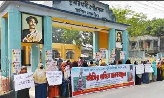 কুষ্টিয়ার কুমারখালী পৌরসভার গাড়িচালক শহিদুল ইসলাম হত্যা মামলার আসামি ১৪ দিনেও গ্রেফতার করতে পারিনি পুলিশ। মামলার তদন্তে নেই কোনো অগ্রগতি। এসবের প্রতিবাদে এবং আসামিদের গ্রেফতার ও দৃষ্টান্তমূলক শাস্তির দাবিতে মানবন্ধন অনুষ্ঠিত হয়েছে।