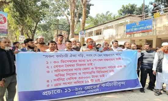 ডিসেম্বরের মধ্যে ৯ম পে-স্কেল ঘোষনা ও বাস্তবায়ন, বেসিক বেতন ন্যূনতম ৩৫ হাজার টাকা নির্ধারণ, গ্রেড সংখ্যা হ্রাস করে বৈষম্য দূরীকরণ, ব্লক পোস্ট বাতিল করে শতভাগ পদোন্নতি নিশ্চিতকরণ এবং টাইম স্কেল ও সিলেকশন গ্রেড পুনঃবহালের দাবিতে বৃহস্পতিবার, (০৪ ডিসেম্বর ২০২৫)দুপুরে নোয়াখালীর চাটখিল উপজেলার সরকারি কর্মচারীরা উপজেলা পরিষদ প্রাঙ্গনে মানববন্ধন করে। মানববন্ধন শেষে তারা চাটখিল উপজেলা নির্বাহী কর্মকর্তা মিজানুর রহমানের কাছে স্মারকলিপি প্রদান করেন।