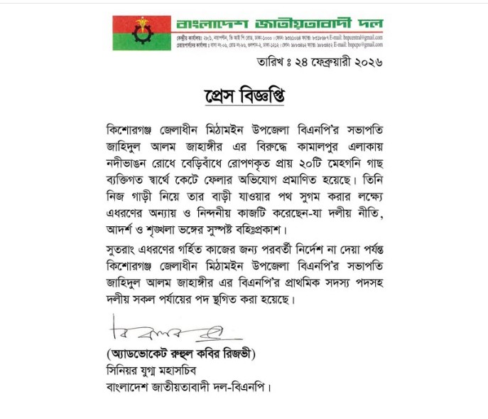 বিজ্ঞপ্তিতে আরও বলা হয়, এ ধরনের গর্হিত কাজের জন্য পরবর্তী নির্দেশ না দেয়া পর্যন্ত কিশোরগঞ্জ জেলাধীন মিঠামইন উপজেলা বিএনপির সভাপতি জাহিদুল আলম জাহাঙ্গীর এর দলীয় প্রাথমিক সদস্য পদসহ সব পর্যায়ের পদ স্থগিত করা হয়েছে।
