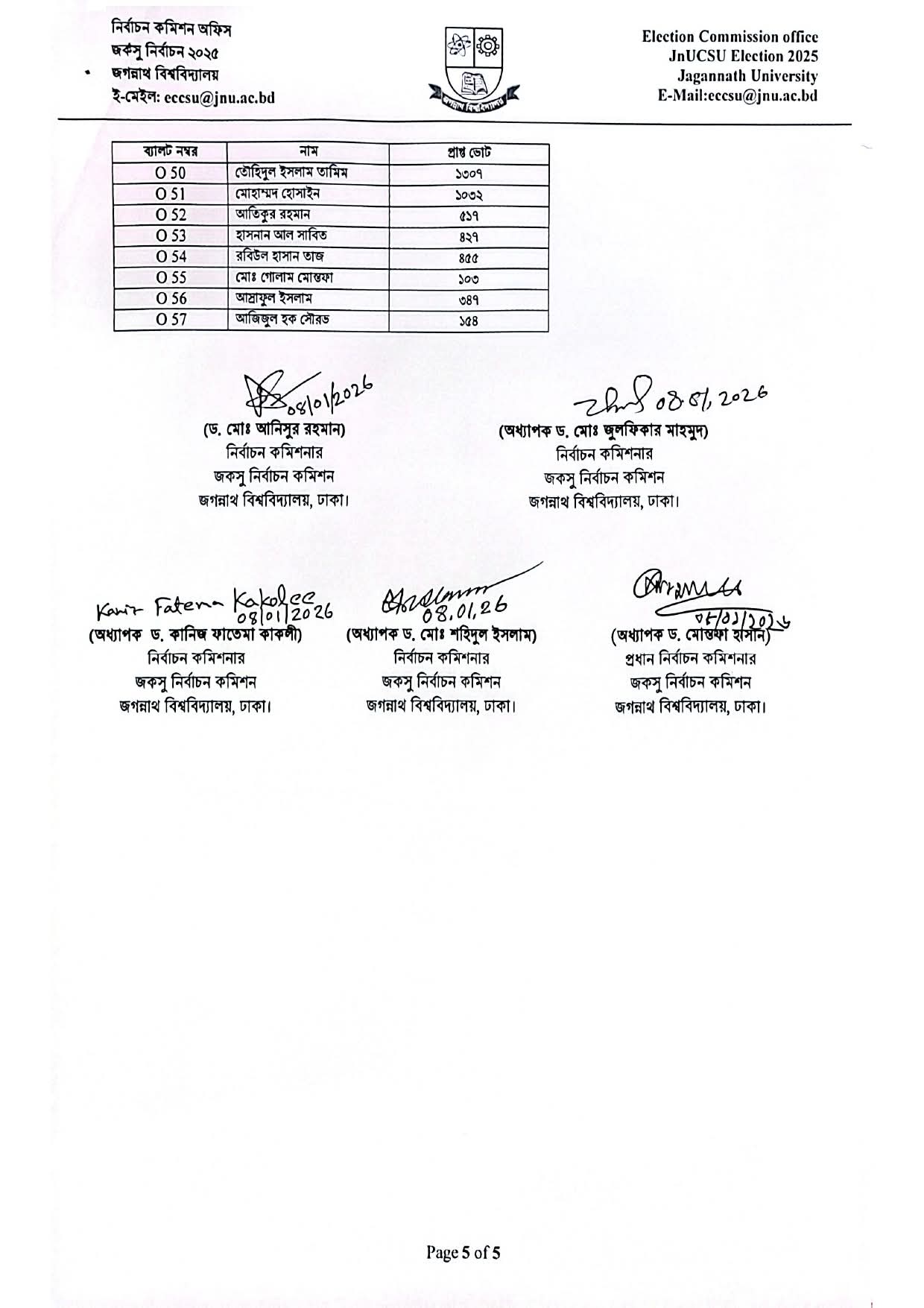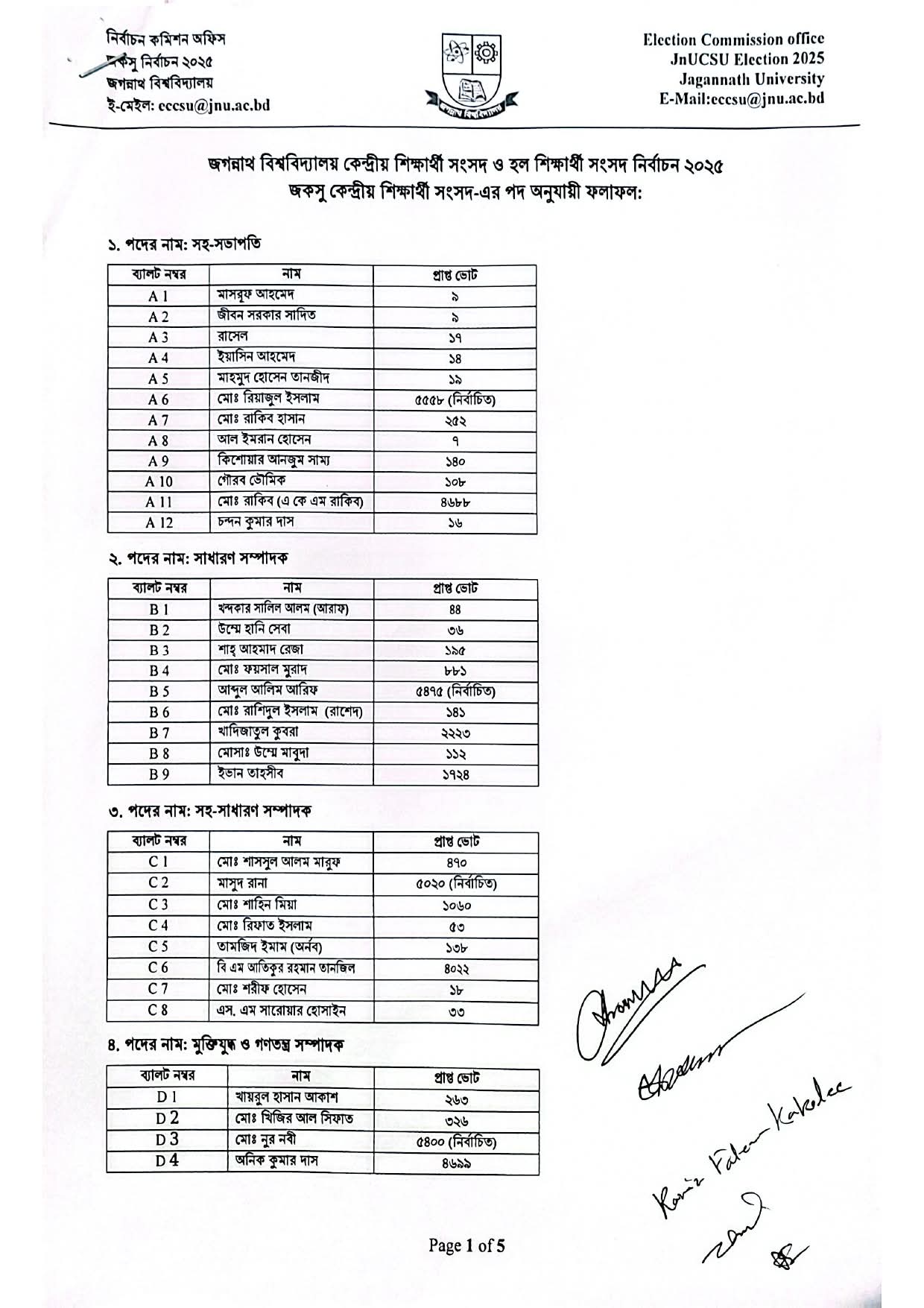জগন্নাথ বিশ্ববিদ্যালয় কেন্দ্রীয় শিক্ষার্থী সংসদ (জকসু) নির্বাচনের চূড়ান্ত ফলাফল প্রকাশের পর ১৫৭ জন প্রার্থীর প্রাপ্ত ভোটের পূর্ণাঙ্গ তালিকা প্রকাশ করেছে নির্বাচন কমিশন।