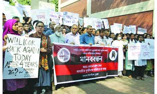 ‘আর কোন প্রাণ যেন অযাচিত দুর্ঘটনায় হারিয়ে না যায়’। বেইলি রোড ট্র্যাজেডিতে শোকার্ত জাতি। শনিবার বুয়েট শিক্ষার্থীরা শোকের মানববন্ধন করে-সংবাদ