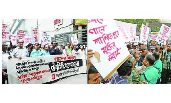 গানের মিছিলে শিল্পীদের হাতে ‘শিক্ষায় সাম্প্রদায়িকীকরণ রুখে দাঁড়াও’, ‘আমরা চাই, হাসি-গানে মুখরিত বাংলাদেশ’, ‘আর কিছু চায় না মনে গান ছাড়া’সহ বিভিন্ন স্লোগান লেখা ফেস্টুন, প্ল্যাকার্ড দেখা যায়।