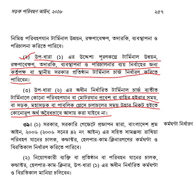 ৩৮(২) ধারায় আরও স্পষ্ট করে বলা হয়েছে, উপধারা (১)-এ নির্ধারিত টার্মিনাল চার্জ ছাড়া, টার্মিনালে কোনো পরিবহন প্রবেশ বা বাহিরের সময়, কিংবা সড়ক–মহাসড়ক–পাবলিক প্লেসে চলাচলের সময় অন্য কোনো অর্থ আদায় করা যাবে না।