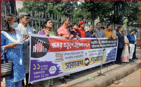 আজ মঙ্গলবার দুপুরে রাজধানীর শাহবাগে একুশে বইমেলা সংগ্রাম পরিষদের ব্যানারে লেখক, পাঠক, প্রকাশক, শিল্পী-সাংবাদিক, সংস্কৃতিকর্মীদের এক সমাবেশ অনুষ্ঠিত হয়। সেখান বক্তারা এসব দাবি জানান।