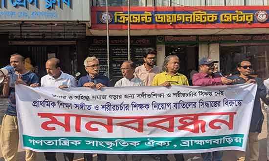 অন্তর্বর্তী সরকার কর্তৃক সরকারি প্রাথমিক বিদ্যালয়ে সংগীত ও শারীরিক শিক্ষা বিষয়ে সহকারি শিক্ষক নিয়োগের বিধান বাতিলের প্রতিবাদে শাহজাদপুরে মানববন্ধন কর্মসূচি পালিত হয়েছে। রোববার, (১৬ নভেম্বর ২০২৫) সকাল সাড়ে ১০টায় উপজেলা পরিষদ চত্বরে এ মানববন্ধন কর্মসূচি পালন করা হয়। উপজেলার বিভিন্ন সাংস্কৃতিক সংগঠন যৌথভাবে এ মানববন্ধন কর্মসূচির আয়োজন করে। প্রায় ঘন্টাব্যাপী মানববন্ধন চলাকালে বক্তব্য রাখেন, সম্মিলিত সাংস্কৃতিক কেন্দ্রের সভাপতি এ এ শহীদুল্লাহ বাবলু, বিবর্তন নাট্যগোষ্ঠীর সভাপতি কাজী শওকত, নজরুল সাংস্কৃতিক পরিষদের সভাপতি ও উপজেলা শিল্পকলা একাডেমির সদস্য সচিব বায়েজিদ হোসেন, আবৃত্তি শিল্পী ও সাংবাদিক কোরবান আলী লাভলু, তরুণ মিউজিক ক্লাবের সভাপতি সঙ্গীত শিল্পী পিএম পলাশ, নৃত্য রং এর পরিচালক জুলিয়া খানম গোলাপ প্রমুখ।