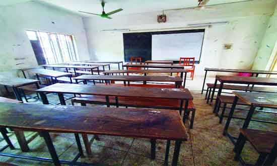 মাধ্যমিক শিক্ষকদের কর্মবিরতিতে সোমবার পুরান ঢাকার কলেজিয়েট স্কুলে কোনো ক্লাস হয়নি। ফাঁকা ছিল ক্লাসরুম -সংবাদ