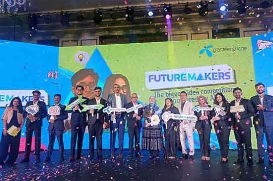 টেলিযোগাযোগ সেবা প্রদানকারী প্রতিষ্ঠান গ্রামীণফোনের আয়োজনে গত ৫ নভেম্বর রাজধানীর একটি হোটেলে অনুষ্ঠিত হলো ‘ফিউচারমেকার্স’ প্রতিযোগিতার গ্র্যান্ড ফিনালে। এটি ছিল জাতীয় পর্যায়ের কৃত্রিম বুদ্ধিমত্তা-ভিত্তিক (এআই) আইডিয়া প্রতিযোগিতা, যা বিশ্ববিদ্যালয় শিক্ষার্থীদের সৃজনশীলতা, উদ্ভাবন ও সমস্যা সমাধানের দক্ষতা প্রদর্শনের সুযোগ করে দিয়েছে। প্রতিযোগিতায় ‘ইশারা: বাংলা সাইন ল্যাঙ্গুয়েজ ট্রান্সলেটর’ প্রকল্পের জন্য চ্যাম্পিয়ন হয়েছে টিম ওয়াটারমেলন। টিম ওপিয়ন তাদের ‘এআই-ড্রিভেন নিউজ ক্রেডিবিলিটি প্ল্যাটফর্ম’ প্রকল্পের জন্য হয়েছে প্রথম রানার-আপ। টিম সিন্যাপজ তাদের ‘এআই ইনক্লুশন ফর ডিফারেন্টলি-এবলড লার্নারস’ প্রকল্প এবং টিম লাস্তা তাদের ‘দিশা: ফাইন্যান্সিয়াল ইনক্লুশন থ্রো এআই’ প্রকল্পের জন্য যৌথভাবে দ্বিতীয় রানার-আপ হয়েছে। বিজয়ীদের হাতে পুরস্কার তুলে দেন বিচারকের দায়িত্বে থাকা গ্রামীণফোনের প্রধান নির্বাহী কর্মকর্তা (সিইও) ইয়াসির আজমান, চিফ হিউম্যান রিসোর্সেস অফিসার সৈয়দা তাহিয়া হোসেন, চিফ বিজনেস অফিসার ড. আসিফ নাইমুর রশীদ এবং চিফ ইনফরমেশন অফিসার ড. নিরঞ্জন শ্রীনিবাসন। এ সময় গ্রামীণফোনের অন্যান্য ঊর্ধ্বতন কর্মকর্তাবৃন্দ উপস্থিত ছিলেন।