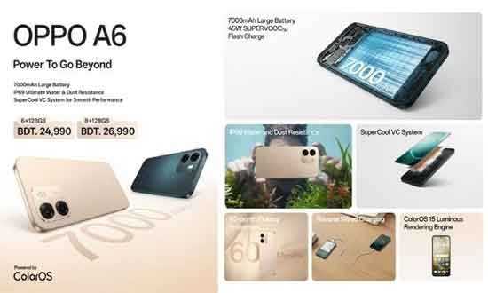 প্রযুক্তি ব্র্যান্ড অপো আনুষ্ঠানিকভাবে বাংলাদেশের বাজারে নতুন স্মার্টফোন অপো এ৬ আনার ঘোষণা দিয়েছে। ও’ফ্যানস ফেস্টিভাল ২০২৫ এর মধ্যে ৭০০০ মিলিঅ্যাম্পিয়ার আল্ট্রা-লার্জ ব্যাটারি, আইপি৬৯ আলটিমেট ওয়াটার অ্যান্ড ডাস্ট রেসিজট্যান্স এবং সুপারকুল ভিসি সিস্টেম সহ অপো এ৬ এর যাত্রা শুরু হলো। ১০ ডিসেম্বর থেকে সারাদেশের সকল অফিসিয়াল অপো স্টোর ও অনুমোদিত ডিলারদের কাছে পাওয়া যাবে অপো এ৬।
