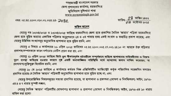 অতিরিক্ত জেলা ম্যাজিস্ট্রেট উম্মে হাবিবা মীরা আরও বলেন, “৩০ মার্চ এবং ৭, ৮, ৯, ১০, ১২, ১৩ এপ্রিল পত্রিকাগুলোর দ্বিতীয় ও তৃতীয় পাতায় সব প্রতিবেদন হুবহু একই ধরনের ছাপা হওয়ায় শোকজ করা হয়। যা ছাপাখানা ও প্রকাশনা (ঘোষণা ও নিবন্ধিকরণ) আইন, ১৯৭৩-এর ৪ ও ৭ ধারার সুস্পষ্ট লঙ্ঘন। তাই ঘোষণাপত্র ছাপাখানা ও প্রকাশনা (ঘোষণা ও নিবন্ধিকরণ) আইন, ১৯৭৩-এর ১০ ধারায় বাতিল করা হয়েছে।”
