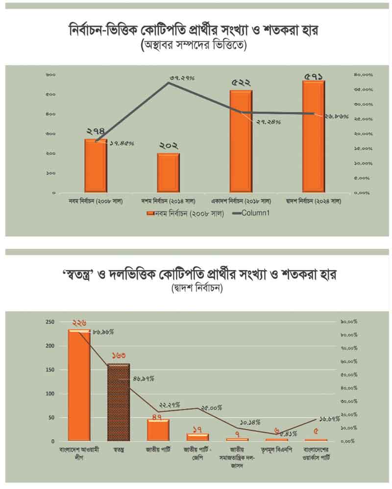 নির্বাচনে অংশ নেয়া প্রার্থীদের হলফনামায় দেখানো সম্পদের তথ্য বিশ্লেষণ করে টিআইবি যে প্রতিবেদন তৈরি করে তাতে কোটিপতি প্রার্থীর সংখ্যা ৫৭১। এর মধ্যে আওয়ামী লীগে ২৩৫ জন কোটিপতি প্রার্থী, জাতীয় পার্টির ৪৭ জন, স্বতন্ত্র ১৬৩ জন, জাসদের ৭ জন কোটিপতি, তৃণমূল বিএনপির ৬ জন কোটিপতি প্রার্থী।