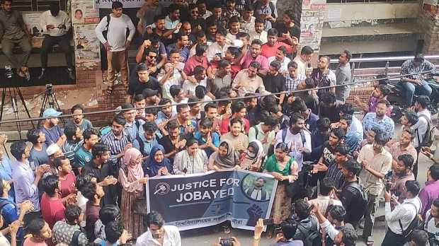 জগন্নাথ বিশ্ববিদ্যালয়ের শিক্ষার্থী ও ছাত্রদল নেতা জোবায়েদ হোসাইনকে হত্যার ঘন্টায় ৩ জন অভিযুক্তের ফাঁসিরর দাবিতে আদালত প্রাঙ্গণে বিক্ষোভ মিছিল করছে বিশ্ববিদ্যালয়ের শিক্ষার্থীরা।