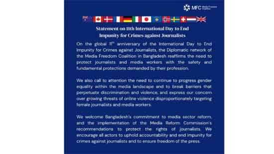 এতে বলা হয়, সাংবাদিকদের বিরুদ্ধে করা অপরাধের দায়মুক্তির অবসান এবং সংবাদপত্রের স্বাধীনতা নিশ্চিত করতে আমরা জড়িত সবাইকে জবাবদিহিতা সমুন্নত এবং সংবাদপত্রের স্বাধীনতা নিশ্চিত করতে উৎসাহিত করছি। বাংলাদেশে মিডিয়া ফ্রিডম কোয়ালিশনের বিবৃতিতে সই করেছে অস্ট্রেলিয়া, কানাডা, সুইজারল্যান্ড, ফ্রান্স, জার্মানি, ইতালি, জাপান, কসোভো, ডেনমার্ক, সুইডেন, নরওয়ে, নেদারল্যান্ড ও যুক্তরাজ্য।