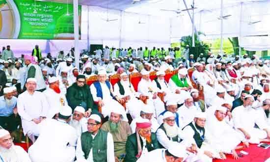 সোহ্রাওয়ার্দী উদ্যানে খতমে নবুওয়ত বাংলাদেশের বিশাল সমাবেশ (ইনসেটে) মঞ্চে উপবিষ্ট নেতারা -সংবাদ