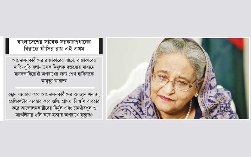 চব্বিশের জুলাই গণঅভ্যুত্থান দমানোর চেষ্টায় ‘মানবতাবিরোধী অপরাধ’ সংঘটনের দায়ে দোষী সাব্যস্ত করে ক্ষমতাচ্যুত প্রধানমন্ত্রী শেখ হাসিনাকে মৃত্যুদণ্ড দিয়েছে আন্তর্জাতিক অপরাধ ট্রাইব্যুনাল। শেখ হাসিনার সরকারের স্বরাষ্ট্রমন্ত্রী আসাদুজ্জামান খান কামালেরও একই সাজা হয়েছে। ওই অভ্যুত্থানের সময় পুলিশপ্রধানের দায়িত্বে থাকা চৌধুরী আবদুল্লাহ আল-মামুন দায় স্বীকার করে রাজসাক্ষী (অ্যাপ্রুভার) হওয়ায় তাকে দেয়া হয়েছে ৫ বছরের কারাদণ্ড।