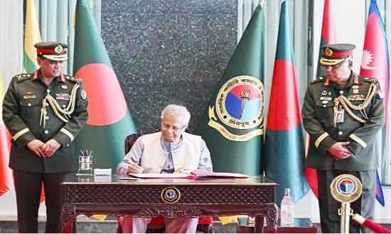 বুধবার, রাজধানীর মিরপুর সেনানিবাসে ডিএসসিএসসি কমপ্লেক্সে সামরিক বাহিনী কমান্ড ও স্টাফ কলেজ পরিদর্শন বইয়ে সই করেন প্রধান উপদেষ্টা -পিআইডি