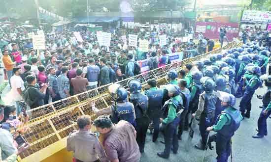 বিসিএসের লিখিত পরীক্ষা পেছানোর দাবিতে আন্দোলনরত শিক্ষার্থীরা শহীদ মিনার থেকে শাহবাগ যাওয়ার পথে পুলিশি বাধার মুখে পড়ে -সংবাদ