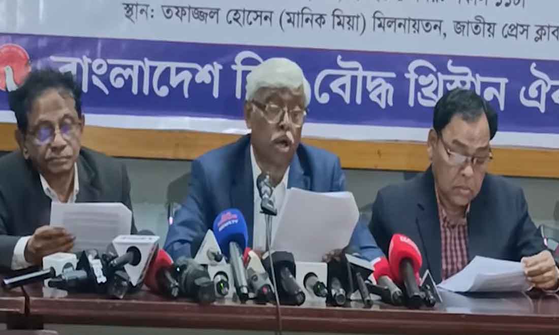 গত বৃহস্পতিবার জাতীয় প্রেসক্লাবে ‘চলমান সাম্প্রদায়িক সহিংসতা এবং আসন্ন ত্রয়োদশ জাতীয় সংসদ নির্বাচন’ শীর্ষক সংবাদ সম্মেলনে এই বক্তব্য তুলে ধরা হয়। সংবাদ সম্মেলনে লিখিত বক্তব্য পাঠ করেন হিন্দু-বৌদ্ধ-খ্রিস্টান ঐক্য পরিষদের ভারপ্রাপ্ত সাধারণ সম্পাদক মনীন্দ্রকুমার নাথ। উপস্থিত ছিলেন ঐক্য পরিষদের সভাপতি ড. নিমচন্দ্র ভৌমিক ও নির্মল রোজারিও, প্রেসিডিয়াম সদস্য অ্যাডভোকেট সুব্রত চৌধুরী, কাজল দেবনাথ, জে এল ভৌমিক ও রঞ্জন কর্মকার, সাংগঠনিক সম্পাদক পদ্মাবতী দেবী প্রমুখ।