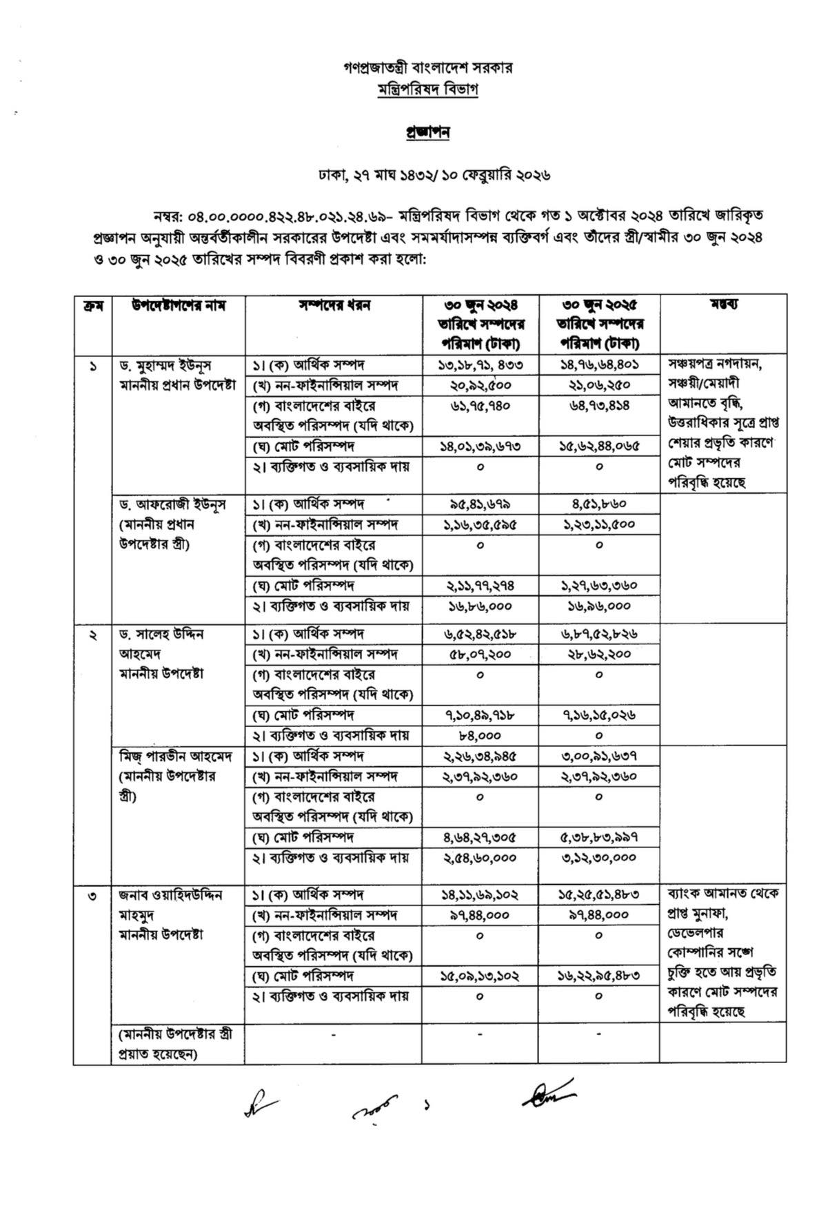 অন্তর্বর্তীকালীন সরকারের প্রধান উপদেষ্টাসহ সব উপদেষ্টার আয় ও সম্পদের বিবরণী প্রকাশ করেছে মন্ত্রিপরিষদ বিভাগ। মঙ্গলবার (১০ ফেব্রুয়ারি) জারি করা প্রজ্ঞাপন অনুযায়ী, ২০২৫ সালের ৩০ জুন পর্যন্ত প্রধান উপদেষ্টা অধ্যাপক মুহাম্মদ ইউনূসের মোট সম্পদের পরিমাণ দাঁড়িয়েছে ১৫ কোটি ৬২ লাখ ৪৪ হাজার টাকা। যা এক বছর আগে ছিল ১৪ কোটি ১ লাখ ৩৯ হাজার টাকা। ফলে এক বছরে তার সম্পদ বেড়েছে ১ কোটি ৬১ লাখ টাকা।