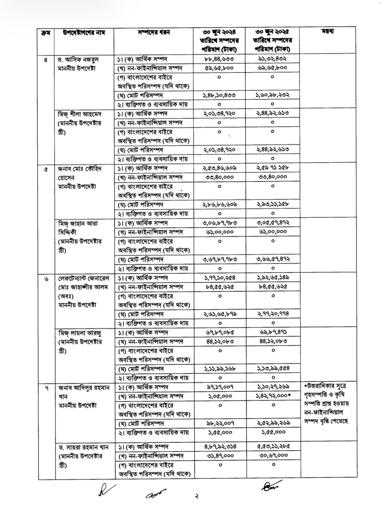 জাতীয় নিরাপত্তা উপদেষ্টা ড. খলিলুর রহমানের ক্ষেত্রে দেখা গেছে, তাঁর দেশে থাকা আর্থিক সম্পদ এক বছরে ২০ লাখ টাকা থেকে বেড়ে ২২ লাখ টাকা হয়েছে। তবে তাঁর নামে বিদেশে ১২ লাখ মার্কিন ডলারের দায় রয়েছে, যা আগের বছরের তুলনায় সামান্য কমেছে।