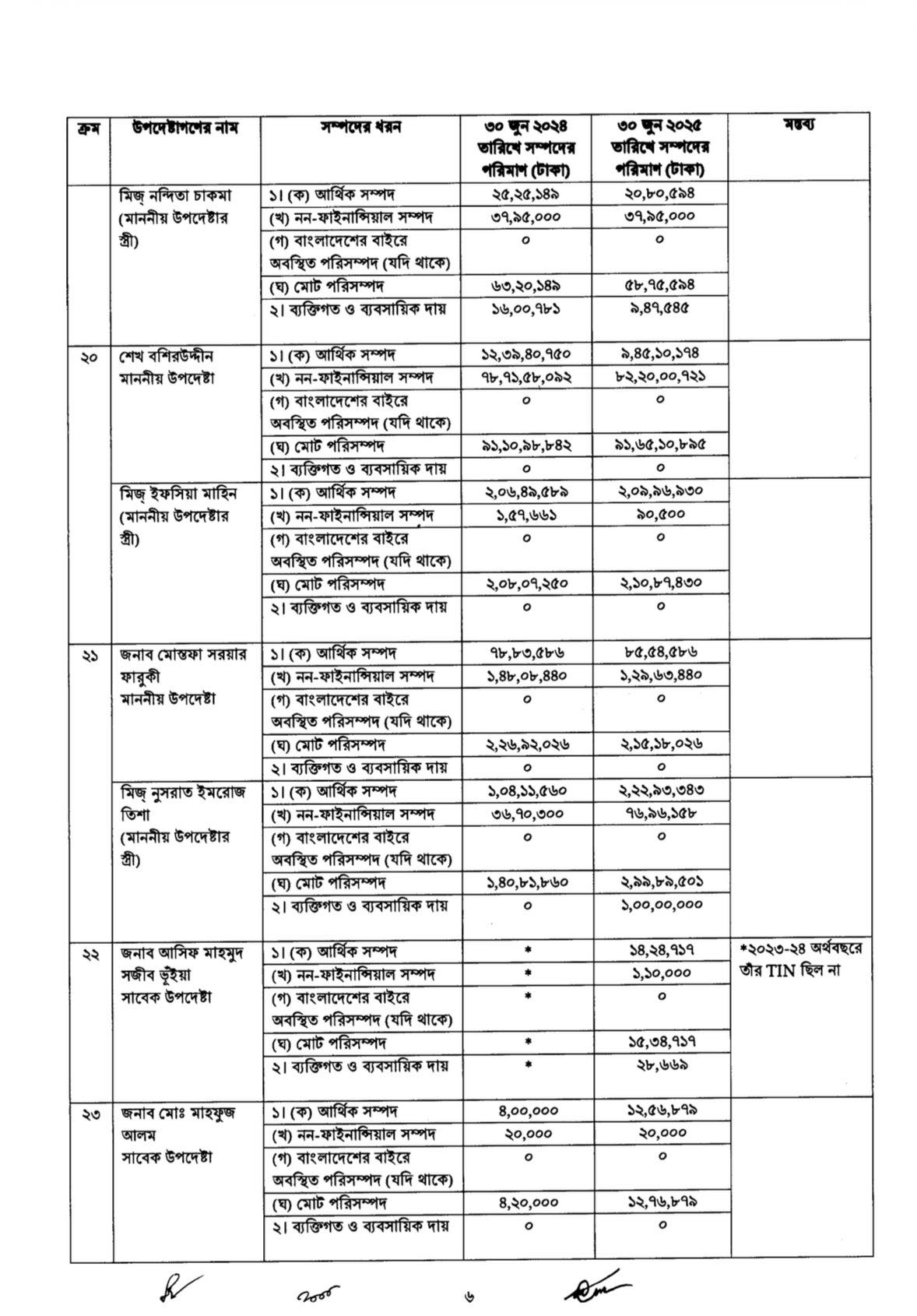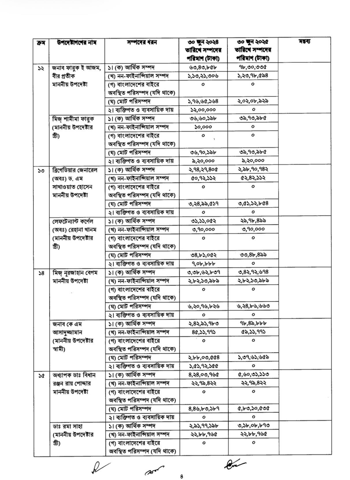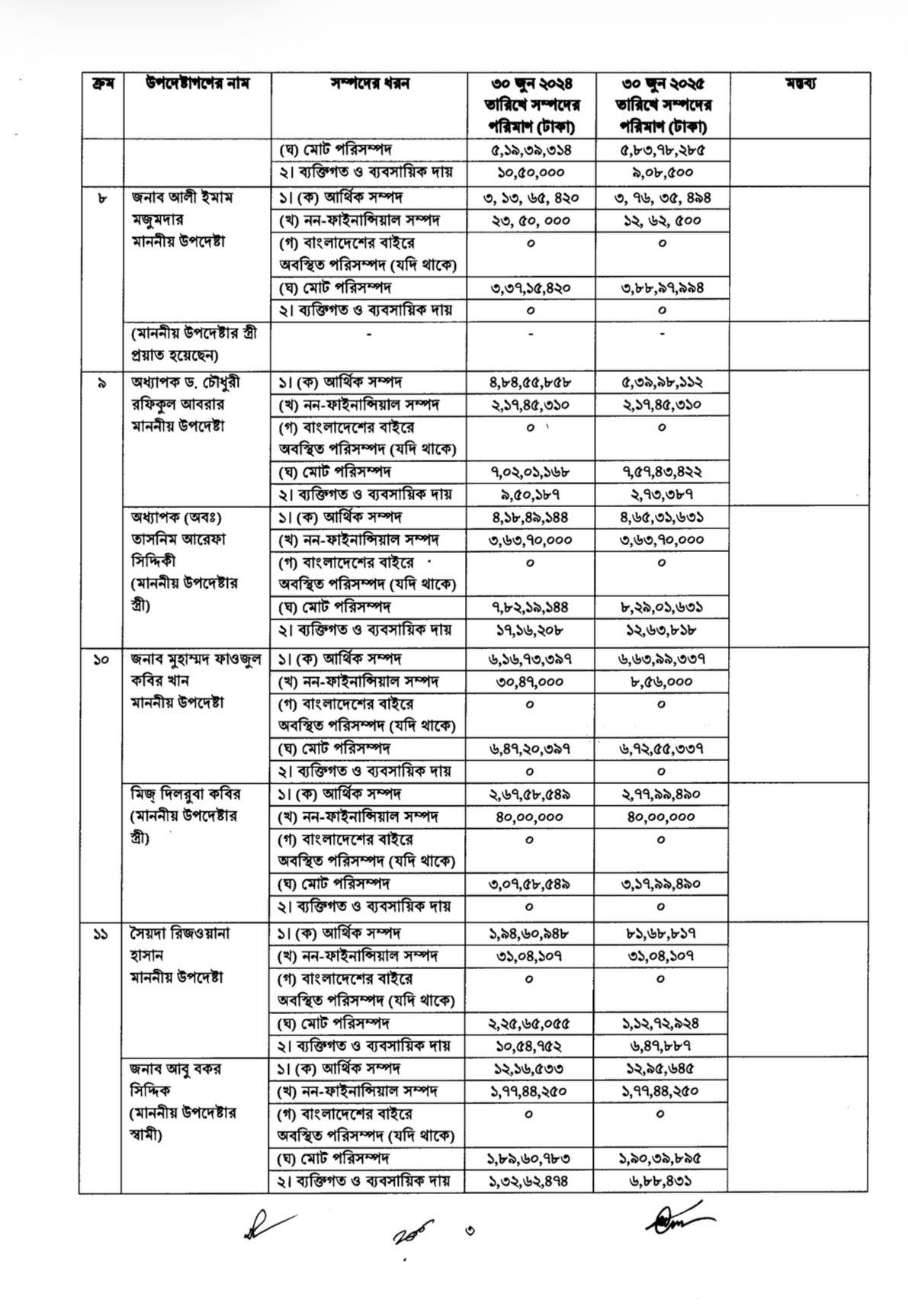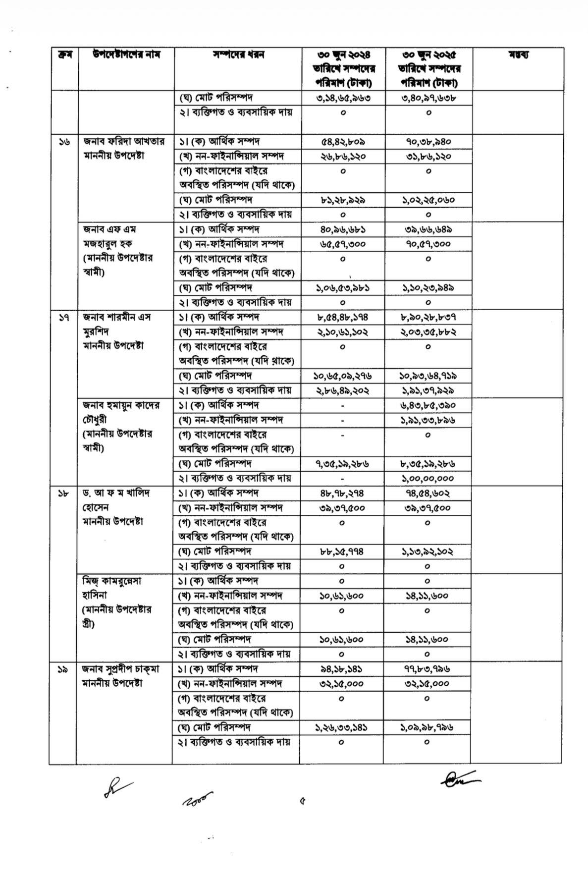 প্রকাশিত তথ্যে আরও দেখা গেছে, পরিবেশ, বন ও জলবায়ু পরিবর্তনবিষয়ক মন্ত্রণালয়ের উপদেষ্টা সৈয়দা রিজওয়ানা হাসানের সম্পদ এক বছরে কমেছে সবচেয়ে বেশি। ২০২৪ সালের ৩০ জুনে তাঁর মোট সম্পদ ছিল ২ কোটি ২৫ লাখ টাকা, যা ২০২৫ সালের ৩০ জুনে কমে দাঁড়িয়েছে ১ কোটি ১২ লাখ টাকায়। ফলে এক বছরে তাঁর সম্পদ কমেছে প্রায় ১ কোটি ১২ লাখ টাকা। একই সময়ে তাঁর ব্যক্তিগত ও ব্যবসায়িক দায়ও কিছুটা কমেছে।