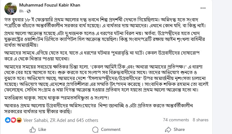 “গত বুধবার ১৮ ই ফেব্রুয়ারি প্রথম আলোর দগ্ধ ভবনে শিল্প প্রদর্শনী দেখতে গিয়েছিলাম। অগ্নিদগ্ধ হতে সংবাদ পত্রটিকে বাঁচাতে অন্তর্বর্তীকালীন সরকার ব্যর্থ হয়েছে। এ ব্যর্থতার দায় আমাদের। এখানে কোন যদি, বা কিন্তু নাই।