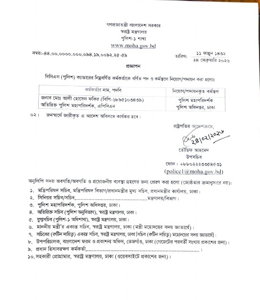 বিসিএস (পুলিশ) ক্যাডারের ১৫তম ব্যাচের সদস্য মো. আলী হোসেন ফকিরকে আওয়ামী লীগ শাসনামলে রাজনৈতিক কারণে একবার চাকরিচ্যুত করা হয়। বিএনপি আমলে সেই চাকরি ফিরে পান। এরপর আওয়ামী লীগ আমলে আবারও তাকে বাধ্যতামূলক অবসরে পাঠানো হয়েছিল।